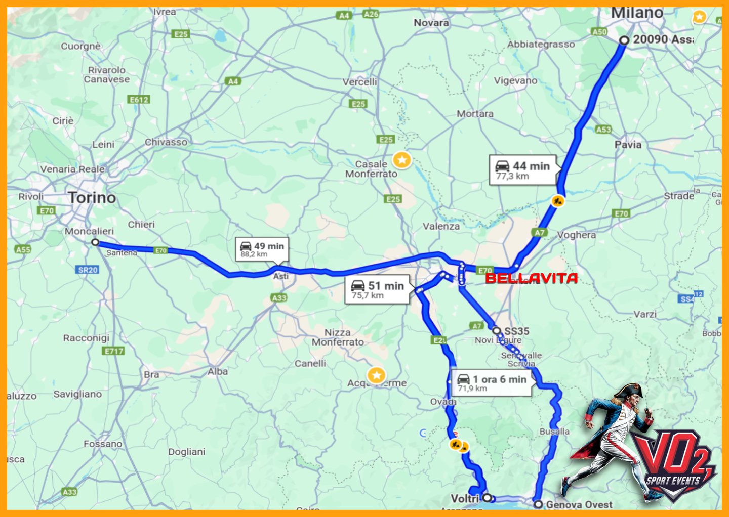 DA MILANO (ASSAGO): 44 MIN. | DA TORINO (MONCALIERI): 49 MIN. | DA GENOVA (VOLTRI): 51 MIN. | DA GENOVA (OVEST): 65 MIN.